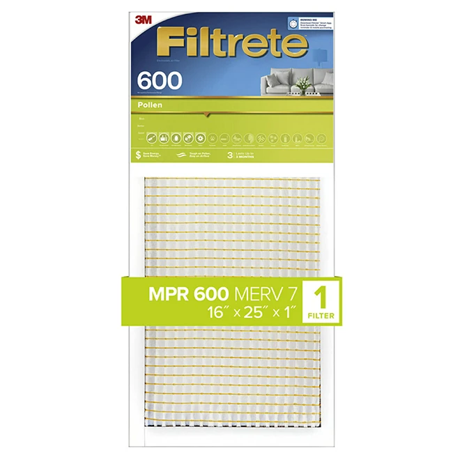 Air filter. 16 in. x 25 in. Captures large, airborne allergens like mold spores and large dust particles. Excellent for high-velocity equipment. Lasts 3 months. 3M 600 Microparticle Performance Rating(MERV 8). No unnecessary antimicrobial chemicals added. “Filtrete” filtering material will not support the growth of bacteria, mold, mildew or fungi in normal use.