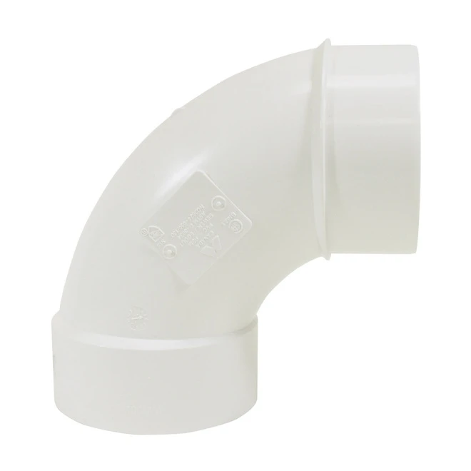 This 90-degree elbow is used to alter the direction of a pipe run in drainage and vent systems, and to connect pipes to the hub end of a PVC fitting.