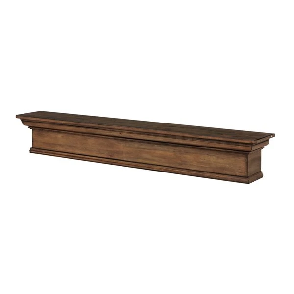 We do not treat the mantel as trim or moulding but as a beautiful piece of furniture that is the focal point of the entire room. Furniture is arranged around it, precious treasures are displayed on it, and it provides balance and stability to the entire room. Pearl Mantels features fine furniture quality, stunning details and classic designs that will enhance any decor. Chestnut finish is lightly distressed with burnished edges. Use over the hearth, in the bedroom, bathroom, kitchen, den or anywhere you need a little something extra for storage or treasures. This shelf is hollow in the back, giving the appearance of solid wood, without the weight. Mitred hanger boards are included for ease of hanging. Shelf length: 72-in shelf depth: 9-in bottom base depth: 6.5-in bottom base length: 67-in overall height: 9-in, weight 39 lb. Look for the pearl inlay that graces the right-hand side of the shelf as proof that you have received an authentic Pearl Mantel.