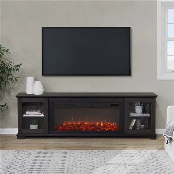 The Benjamin Electric Fireplace Media Cabinet has a multifunctional design with a low, clean profile and shelving behind glass doors. This modern fire feature can be used as an entertainment centre by placing a TV directly on or above the unit or enjoy it as a decorative piece to safely display your favourite items. Part of the Real Flame Landscape Series, this widescreen electric firebox mimics the look of a real fire but does not require a chimney or vents and conveniently plugs into a standard outlet.